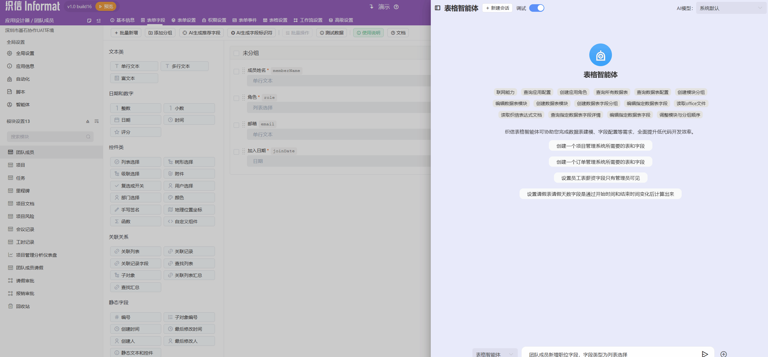 [011271] 【AI】表格智能体支持列表选择颜色、显示宽度、编号表达式、权限可见可编辑等能力