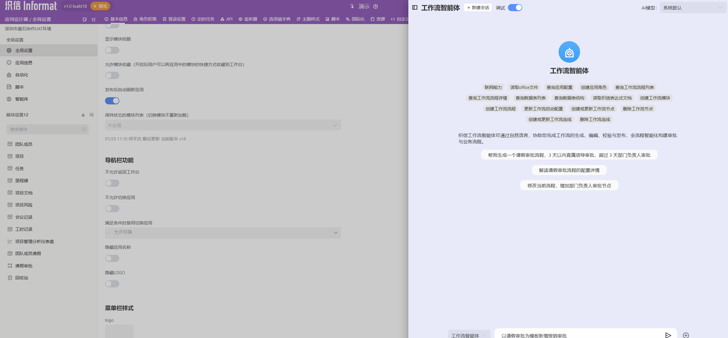 本次版本聚焦 AI 智能体体系的整体完善 与 设计器脚本能力的系统性增强,正式补齐「网站 / API / 定时任务 / 国际化」四大核心智能体,并引入 Agent Skills 能力体系,支持将应用设计能力以可组合、可复用的 Skills 形式开放给智能体调用,打通从应用设计、能力编排到自动化执行的完整链路,进一步降低复杂应用的构建与运维成本。